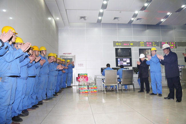 1月26日,縣長(zhǎng)郅書安帶領(lǐng)四大班子領(lǐng)導(dǎo)到發(fā)電公司慰問一線員工,公司董事長(zhǎng)李躍民、總經(jīng)理郭峰等陪同。